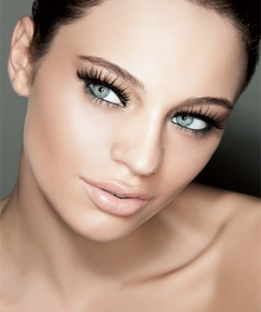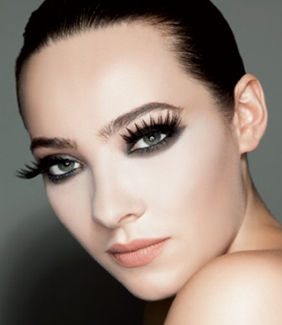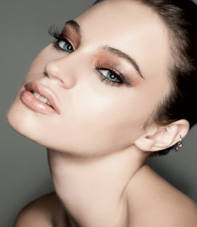 Passe uma sombra perolada em toda a pálpebra. Cubra o espaço entre a raiz dos cílios e a pálpebra para fazer um fundo com um traço médio de delineador para cobrir os espaços entre os cílios postiços e o verdadeiro. Só depois cole os cílios postiços gráficos(que intercalam curtos com longos), de preferência com cola transparente. Passe várias camadas de máscara para evitar falhas entre a cor dos cílios postiços e a dos naturais. Faça um traço fino de lápis rosa dentro dos cílios inferiores. Marque as maçãs com umblush pêssego mate e finalize os lábios com um delineador marrom e, sobre ele, umbatom marrom-claro.